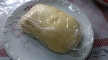 – Para que você possa moldar ou recortar com forminhas a massa ela tem que ter ficado um tempinho na geladeira, assim facilita o manuseio.
