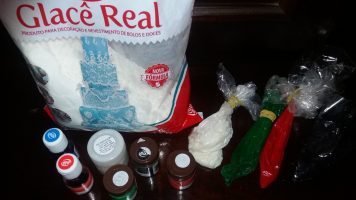 – Se você for decorar, tem em lojas especializadas, corantes alimentícios e a mistura para preparo do glacê real. Que você vai seguir as instruções da embalagem pra preparar.
